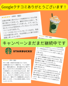 Google口コミ投稿していただいた皆さまへ、もれなく全員に「スタバドリンクチケット700円」プレゼントします。 更にその中から選考の結果、3名さまに「スタバギフトカード3000円」プレゼントを差し上げます!